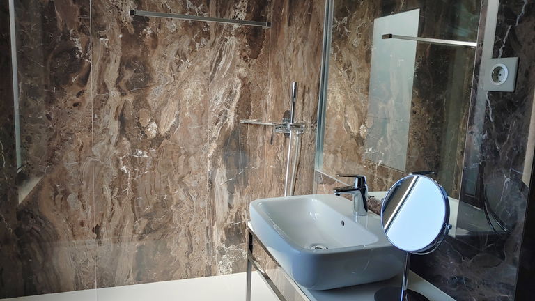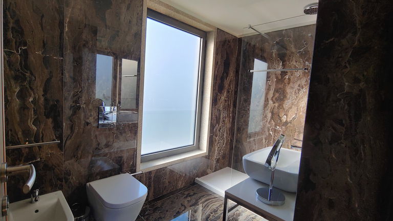 The room has: double bed (180cm * 2m), chaise longue (80cm * 2m) and sofa bed (80cm * 2m). In addition to a living room, two bathrooms with shower, hairdryer, minibar, telephone, amenities, safe, 43 'Smart TV and free Wi-Fi.