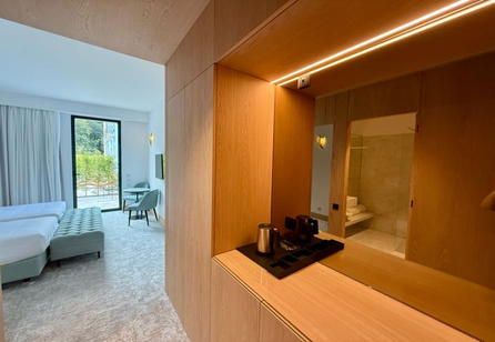 Our modern rooms with terraces are equipped with all the amenities you could need, both inside the room, where you will find two single beds (90* 200) or one double bed (200* 200), and on the terrace, where you can enjoy nature in the comfort of the sun loungers and let yourself be carried away by the peace that only a natural enclave like Melgaço can offer.