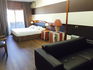 Cama king size, sofa, nevera, 2 TV y balcón.