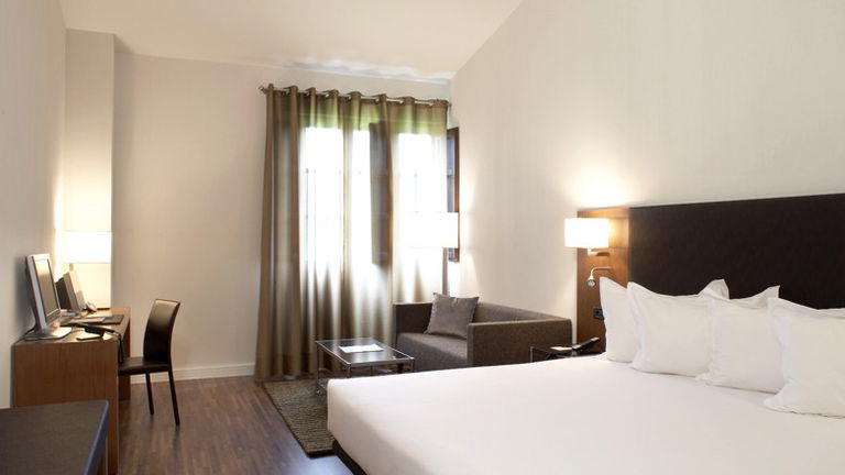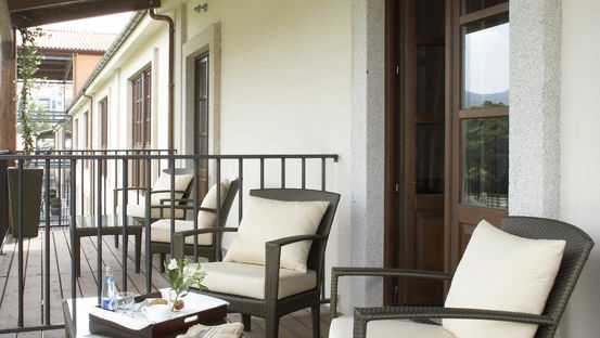 Quarto superior amplo com varanda ou terraço, cama king-size e sofá-cama duplo.