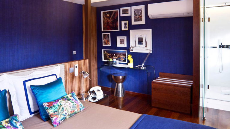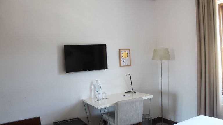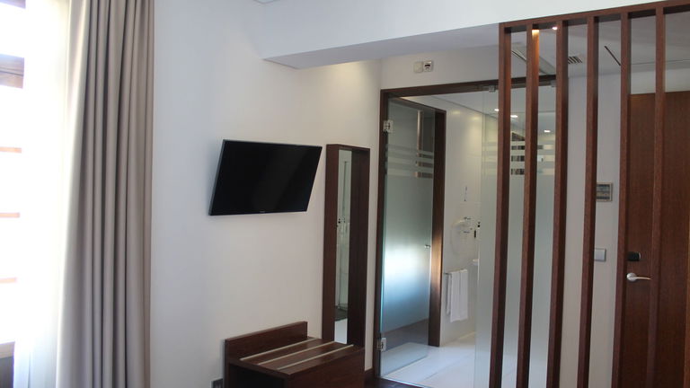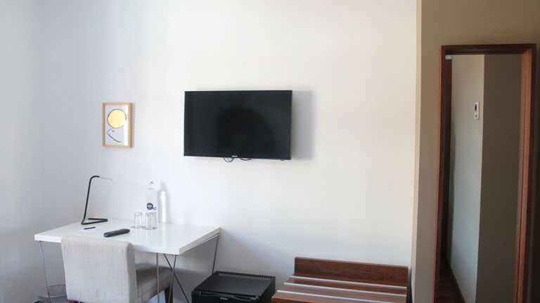 Quarto elegante e climatizado com uma cama de casal e uma televisão de ecrã plano. A casa de banho privativa inclui produtos de higiene pessoal e um secador de cabelo..