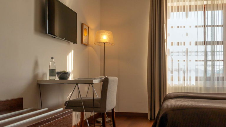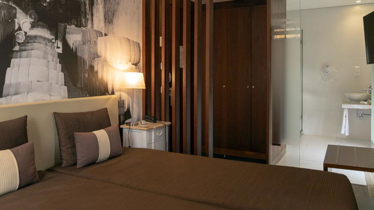 Quarto elegante e climatizado com 2 camas solteiro e uma televisão de ecrã plano. A casa de banho privativa inclui produtos de higiene pessoal e um secador de cabelo..