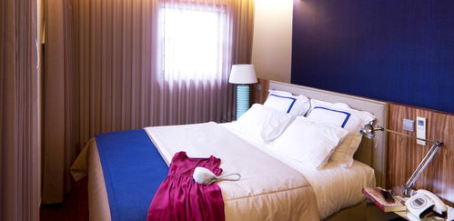 Quarto elegante e climatizado com uma cama de casal e uma televisão de ecrã plano. A casa de banho privativa inclui produtos de higiene pessoal e um secador de cabelo..